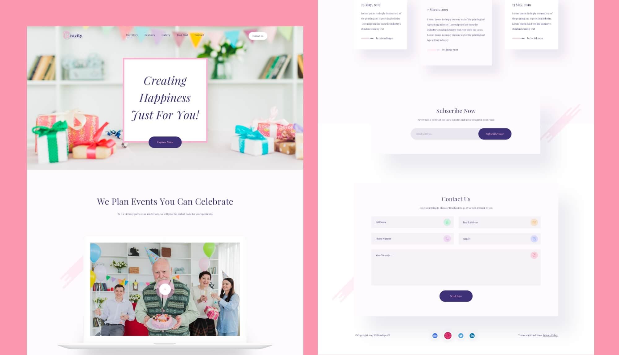 Cravity is a bright, colorful, and beautiful WordPress template made specifically for event management companies, event planning websites, wedding or birthday party planners, and any kind of event planning and management website.